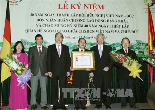 越德友好协会同德国驻越南大使馆9月21日在河内联合举行本协会成立30周年(1985.9.23-2015.9.23)、越德建交40周年(1975.9.23-2015.9.23)纪念典礼暨一级劳动勋章授勋仪式。