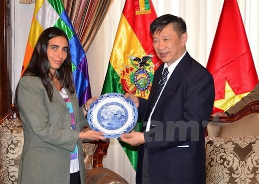 | 越共中央对外部副部长阮俊峰与玻利维亚众议院议长加布里埃拉·蒙塔诺(图片来源:越通社) |