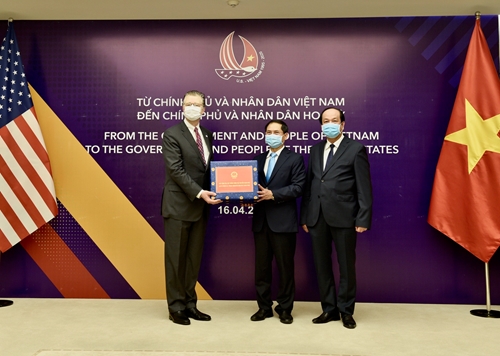 越南领导代表向美国驻越大使赠送医疗用品(图片来源:baochinhphu.vn) |