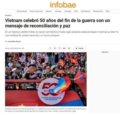 4月30日,阿根廷主流新闻网Infobae发布了一组文章和大量精美图片,报道越南南方解放、国家统一50周年的盛大纪念活动。文章表示,有1.3万人参与了在胡志明市举行的阅兵游行活动。
