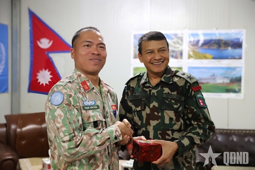 尼泊尔支援部队指挥官 Bhupendra Godar 中校与越南同事(图片来源:人民军队报) |