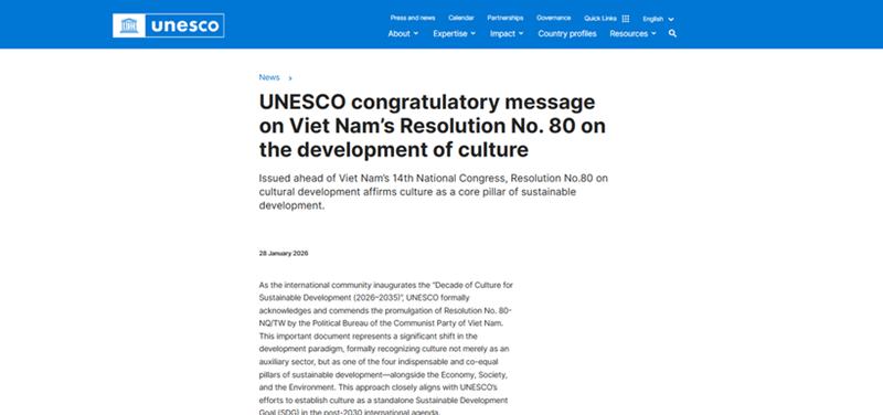 1月28日,联合国教育、科学及文化组织(UNESCO)官网刊登了UNESCO祝贺越南共产党中央政治局颁布关于发展越南文化的第80-NQ/TW号决议的贺文。