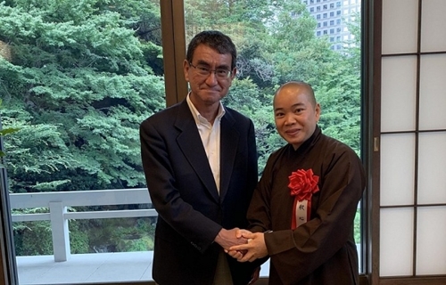 日本外务大臣河野太郎(左)与日本越南佛子会会长释心智(图片来源:thoidai.com.vn) |