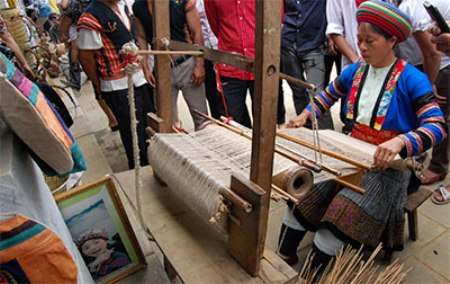 赫蒙族(Hmong)妇女在越南民族文化旅游村的偏远山区逢集上介绍本民族传统纺织工艺(图片来源:人民军队报)