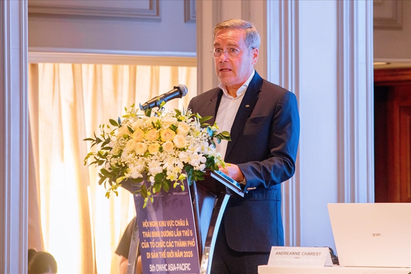 世界遗产城市组织秘书长米凯尔·德·蒂斯发表讲话(图片来源:越通社) |