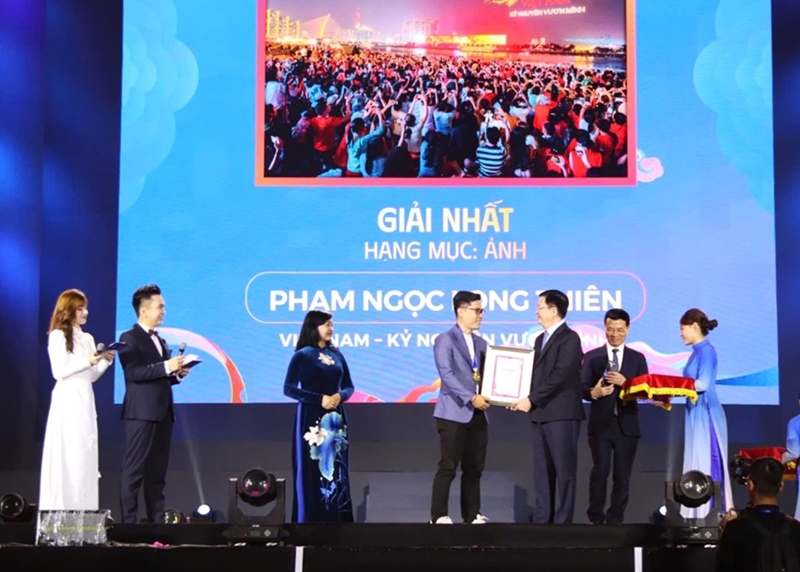 在颁奖典礼上,范玉隆天的作品《越南——奋发图强的时代》摄影作品荣获了摄影类一等奖;视频类一等奖属于刘明姜的《幸福的笑容》。