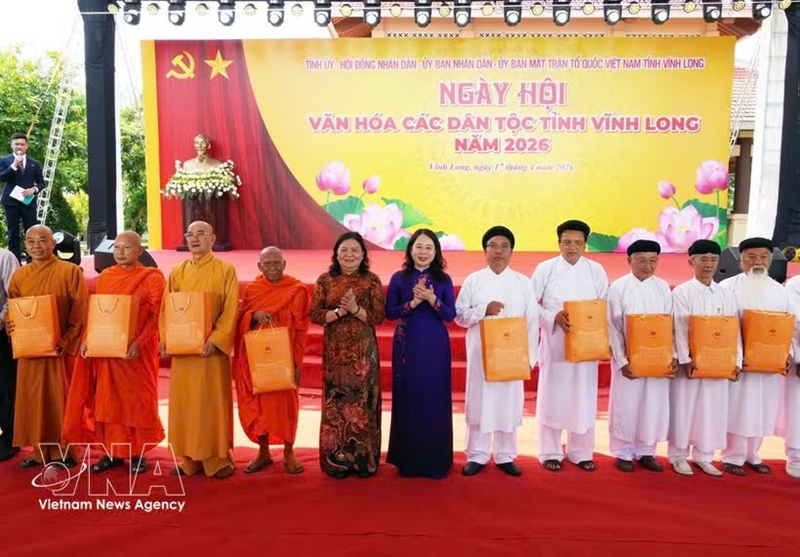 4月17日,永隆省委、人民议会、人民委员会及越南祖国阵线永隆省委员会在武文杰总理纪念区(中诚乡)隆重举行2026年永隆省各民族文化节。越共中央书记处书记、国家副主席武氏映春,永隆省领导,以及少数民族乡贤和宗教组织代表共同出席了开幕式。