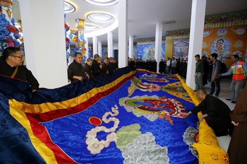 这幅刺绣画是由嘉旺竹巴(Gyalwang Drukpa)法王赠送的法宝。该幅画尺寸为11.8mx16m, 重量超100公斤,由40名艺人连续6个月进行制作。