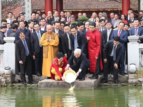 值此农历腊月二十三祭灶节即将来临之际,1月26日下午,越共中央总书记、国家主席阮富仲与夫人同回国出席2019年“家乡之春”活动的众多旅外越侨在还剑湖举行放鱼送灶神仪式,祈求国泰民安、幸福安乐。