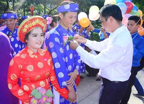 集体婚礼是为家境困难的100对工人、工会团圆、青年的新郎、新娘举办。各对新人在胡志明市少儿馆向胡志明主席敬香献花和放气球祈祷和平。在集体婚礼上,各对新人还获得胡志明市纪念章。