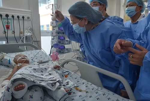 此前,7月15日,经历长达12小时多的手术之后,来自胡志明市各大医院的近100名医护人员已配合成功实施极为罕见的下半身连体双胞胎女婴分离手术。