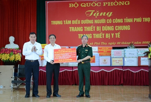 *7月22日下午,由越南人民军总政治局副主任杜根上将率领的中央军委、国防部工作团走访慰问富寿省革命有功者疗养中心,并向中心赠送总价值为9.4多亿越盾的共 用设备和医疗设备。