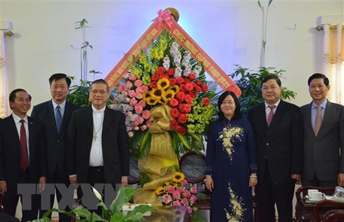 裴氏明怀代表党、国家和越南祖国阵线领导向裴朱教区主教座堂主教武廷校和广大教职人员和信教群众祝贺圣诞,希望大家度过一个平安喜乐的节日。