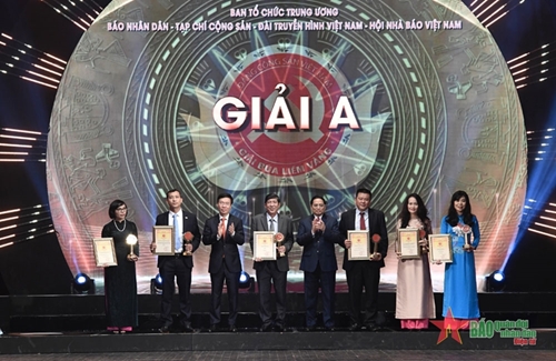 越南政府总理范明政,越共中央书记处常务书记武文赏向获得A等奖作品的作者颁发奖状(图片来源:人民军队报) |