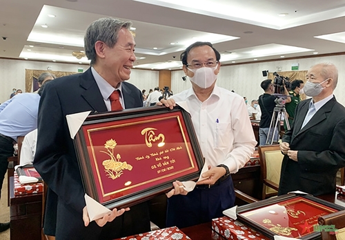 胡志明市领导向各位模范医生赠送礼物(图片来源:人民军队报) |