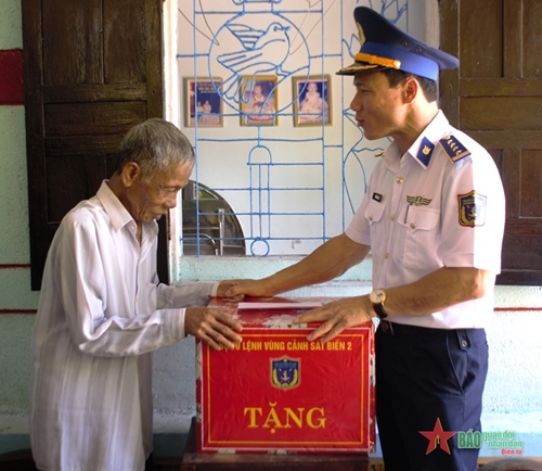 海警第二区司令部领导向邓青香伤员赠送礼物(图片来源:人民军队报)