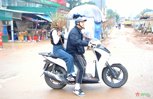帮顾客把所选好的花枝固定在摩托车上带回家(图片来源:人民军队报)