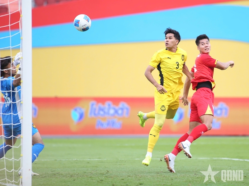 越南U22球员晓明(红衣)头球破门,在同马来西亚U22队的对阵中首开纪录(图片来源:人民军队报)