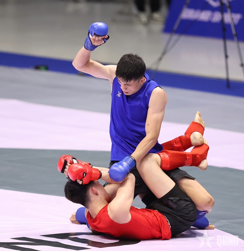 综合格斗选手匡文明(蓝衣)在比赛中占据绝对优势,使对手难以招架(图片来源:人民军队报)