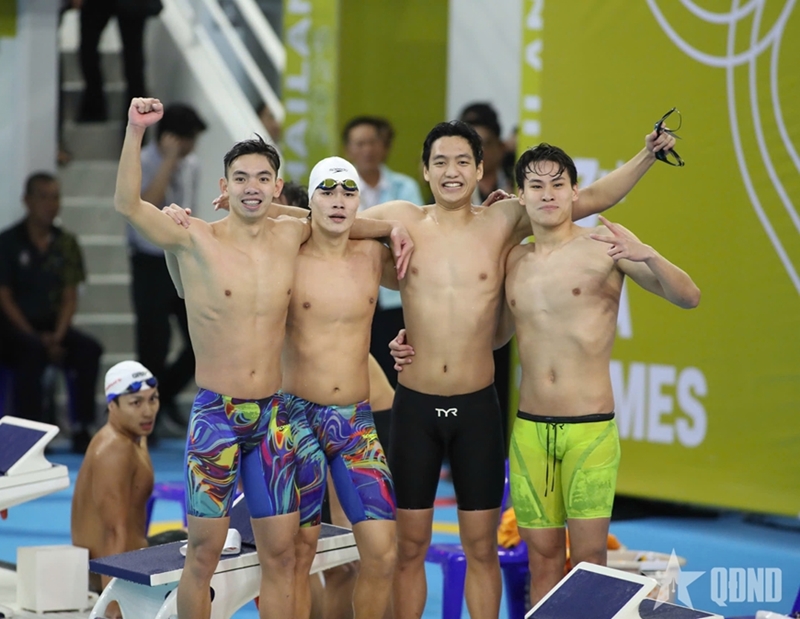 由阮曰祥、阮辉煌、陈文阮国、陈兴元组成的越南男子4x200米自由泳接力队庆祝胜利(图片来源:人民军队报)