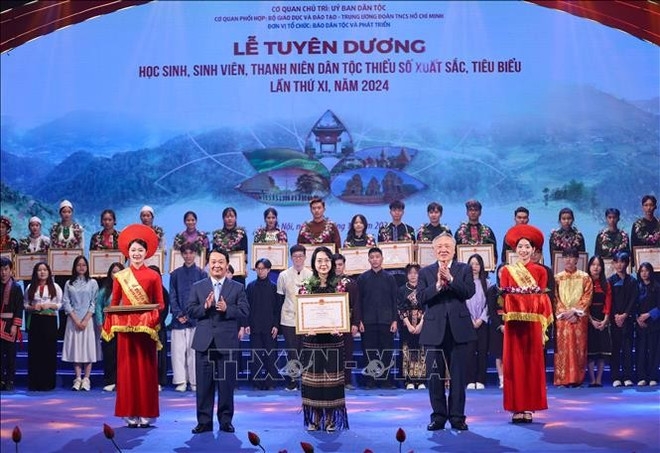 在2024年少数民族典范学生、大学生和青年表彰会上,政府常务副总理阮和平和民族委员会主任、部长侯阿令向少数民族学生颁发奖状(图片来源:越通社) |