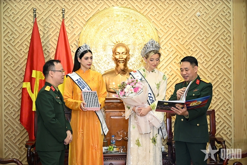 两次会面中,《人民军队报》社党委副书记、副总编辑吴英秋大校向2024年越南小姐前三名及2025年环宇小姐大赛前两名概要介绍了这份两次获得英雄报纸的历史与发展进程,这份荣幸地由胡伯伯命名、首刊于1950年10月20日的报纸。《人民军队报》始终保持着越南顶尖革命新闻机构的地位,是党、国家、军队在思想政治与理论战线上的锐利武器。目前,《人民军队报》拥有印刷版报刊:《人民军队报》日报、《人民军队报》周末版、《事件与证人》月刊;以及越南语、英语、汉语、老挝语、高棉语、俄语版本的《人民军队报》电子版,并持续加强各数字平台的传播力度。