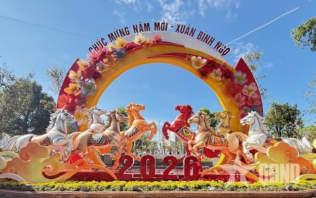 在邦美蜀花卉园和位于邦美蜀坊阮必成街街口的小花园里,技艺精湛的工匠们精心制作了成群的马形吉祥物,为游客在2026丙午期间提供了参观、欣赏美景和拍照留念的好去处。