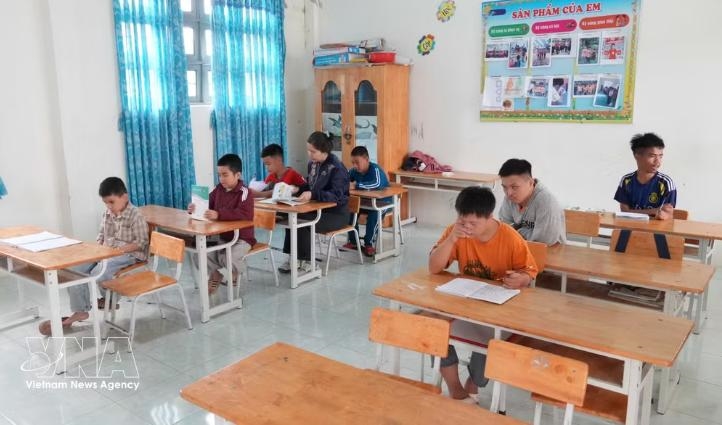 昆嵩省社会工作中心教学点的残疾学生在课堂上学习(图片来源:越通社) |