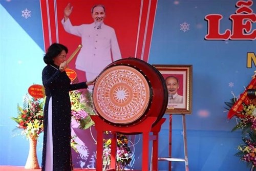越南国家副主席邓氏玉盛打鼓宣布四圻高中学校新学年正式开学(图片来源:越通社) |