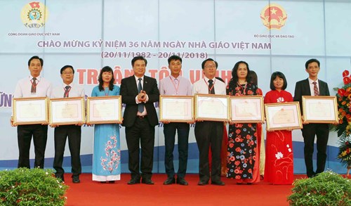 在表彰会上发表讲话时,越南教育培训部副部长阮友度向获表彰的教师队伍给予最美好的祝福。目前,全国拥有约140万名教师。2018年,因出色完成被交付的任务,183名教师被评为优秀模范代表。在表彰会上,教育培训部领导代表向获表彰的教师颁发奖状。