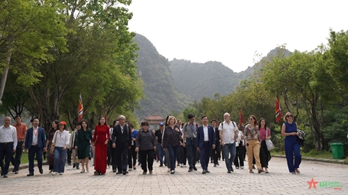 在华闾古都,代表团拜访了丁先皇祠堂和黎大行皇帝祠堂,听取关于大瞿越国的故事。各位代表对越南民族的豪迈传统表示钦佩,对两座祠堂的建筑物感到兴趣。