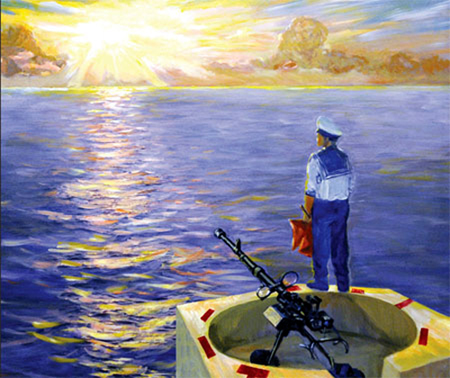 | 画家邓功顽创作的油画《西礁上观日出》(图片来源:人民军队报) |