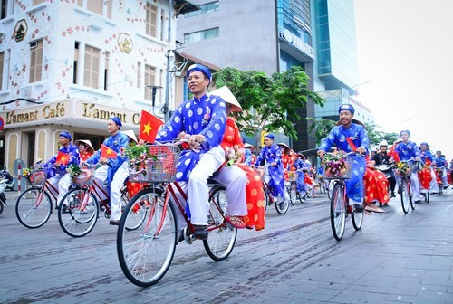 新娘新郎骑车经过胡志明市各条街道(图片来源:人民军队报)