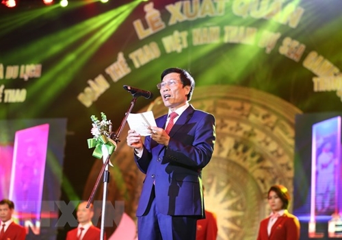 11月16日晚,越南第30届东南亚运动会体育代表团出征仪式在河内举行。越共中央委员、文化体育旅游部部长阮玉善,体育总局领导等出席活动。