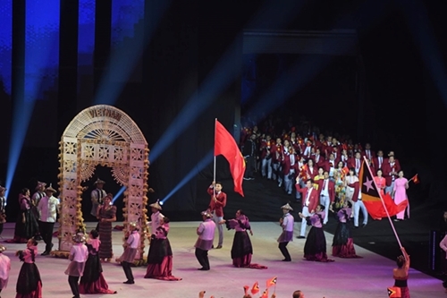开幕式开始,11国家的代表团陆续进场。越南代表团的旗手是击剑赛手武成安。
