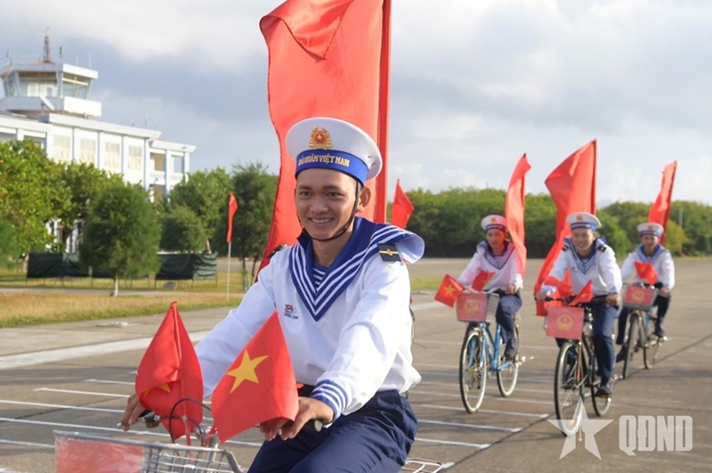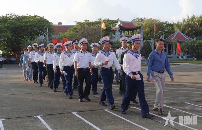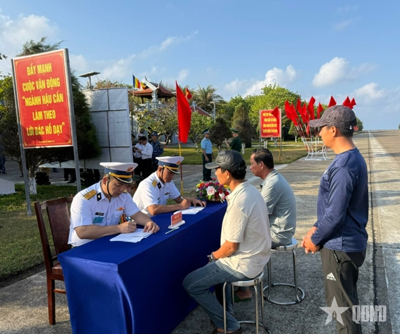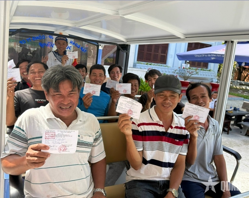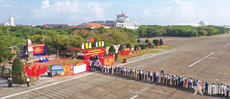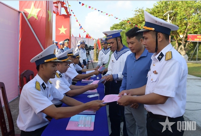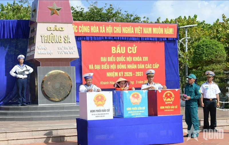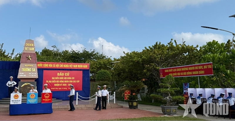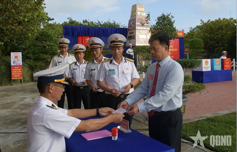 这是越南长沙岛第二次同全国共度选举日。在欢乐而热烈的气氛中,岛上的官兵和居民一大早就聚集在主权界碑象征工程——投票箱就设在那里。