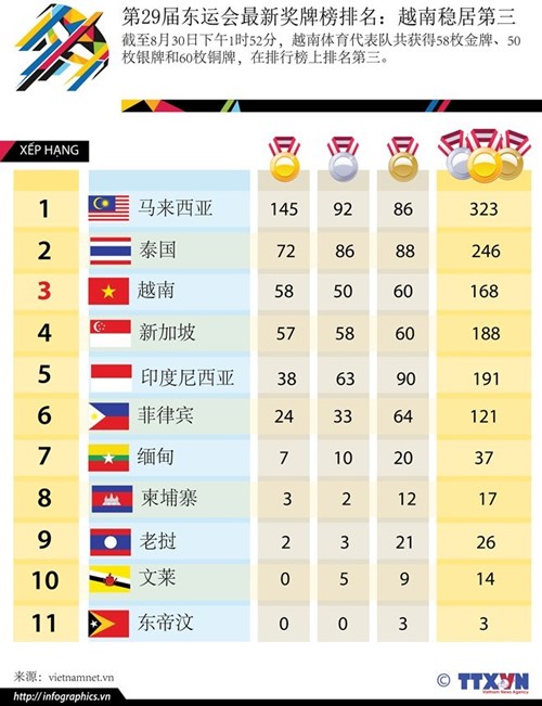 在第29届东运会上,越南体育代表团共夺得58枚金牌、50枚银牌和60枚铜牌,在总奖牌榜上名列第三位。东道国马来西亚以145金、92银、86铜名列第一。