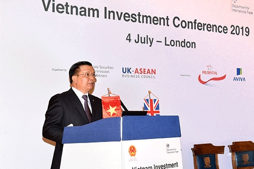 越南财政部长丁进勇7月4日在伦敦金融中心主持召开越南促贸会(图片来源:越通社) |