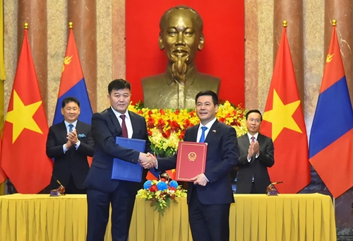 越南国家主席武文赏和蒙古国总统乌赫那·呼日勒苏赫见证越南工贸部和蒙古国食品、农业和轻工业部之间《可持续大米贸易谅解备忘录》签字仪式(图片来源:nhandan.vn) |