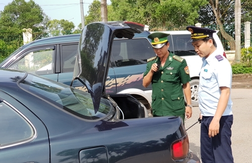坚江省河仙国际口岸干部和边防部队配合,对出入境的车辆进行检查(图片来源:人民军队报) |
