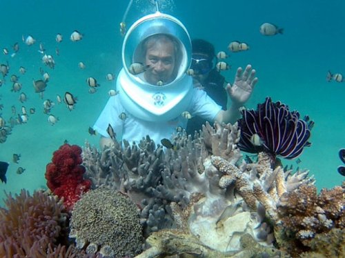尝试该新型旅游产品的游客只要带上一个颇像太空帽的氧气帽就可以在一片50平方米宽的深海底部,一边漫步一边近距离欣赏奇妙美丽而色彩斑斓的海底生物。每次大概可以在水下漫步15到20分钟。