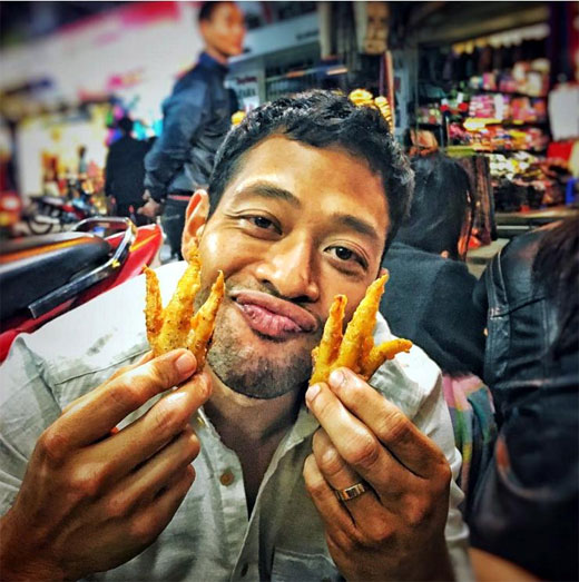 | Jordan Vogt Roberts导演分享Eugene Cordero与河内小吃的图片。在自己的 Instagram上,他表示非常热爱越南路边小吃(图片来源:人民军队报) |