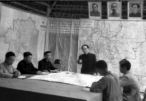 武元甲大将与越南人民军总参谋部研究奠边府战役的计划(资料图)