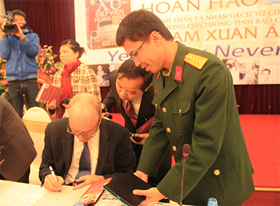 | 2月18日,在河内举行的“X6完美间谍”一书亮相仪式上,拉里•伯尔曼作者与读者合影留念(图片来源:人民军队报) |