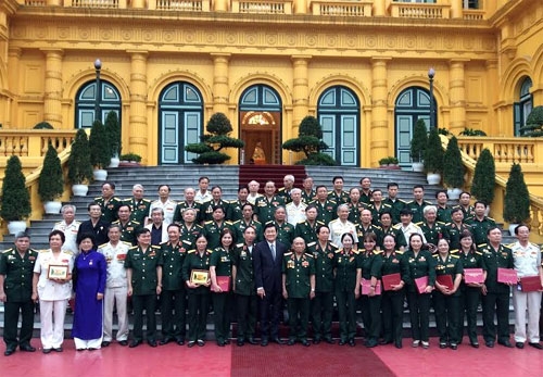 | 越南胡志明小道-长山传统会中央指挥部的成员与国家主席张晋创合影留念(图片来源:人民军队报) |