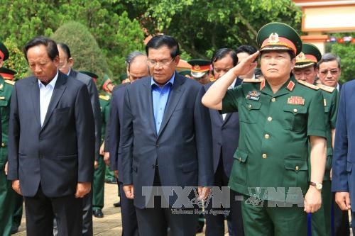 柬埔寨首相洪森与越南国防部部长吴春历大将一行在125团陵园敬香(图片来源:越通社)