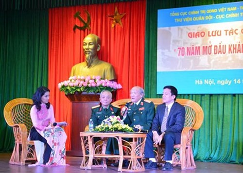 值此之际,军队图书馆举行历史证人及历史研究专家交流会,原总政治局副主任范鸿居中将,武桑蓬大校、博士,阮孟河副教授,武装力量青年等一同参加。