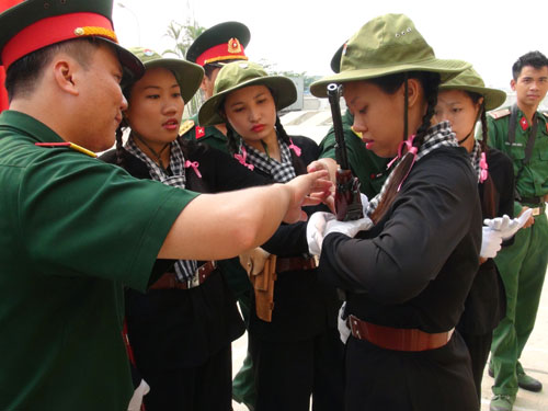 人民军队记者孟胜报道:奠边省奠边府市训练场上太阳如火。在这郁热的天气里,胡志明市108名女民兵还认真进行队列条令训练......