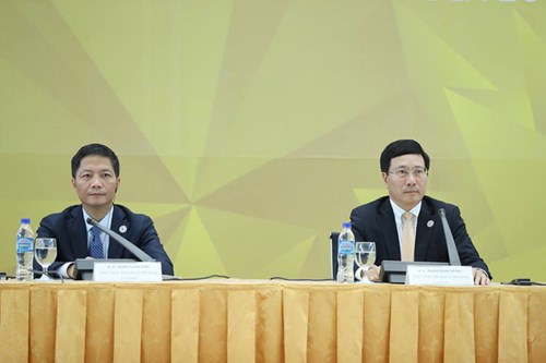 9日下午,越南政府副总理兼外交部长范平明与工贸部部长陈俊英共同主持新闻发布会,向媒体记者通报此次会议的结果。